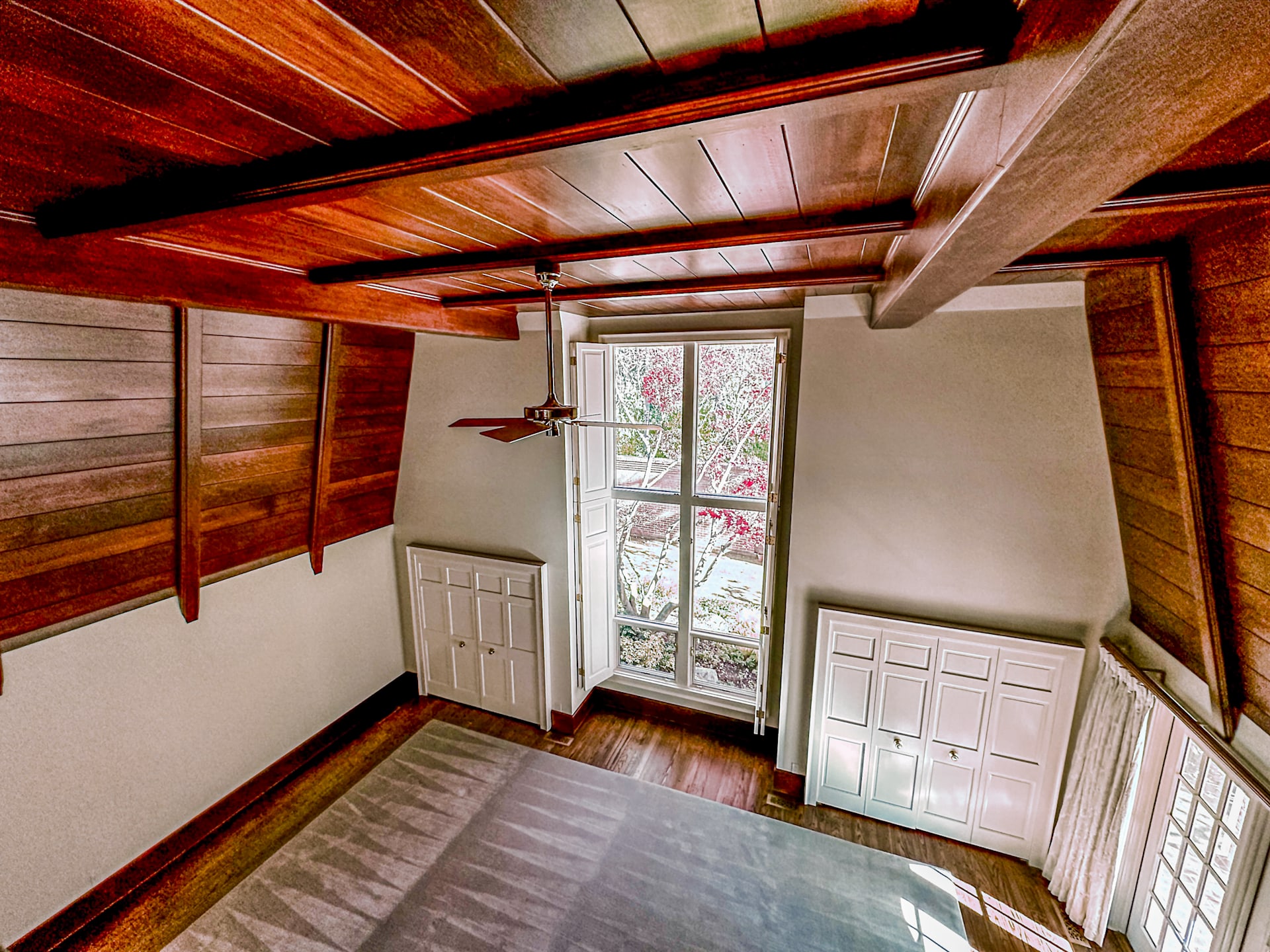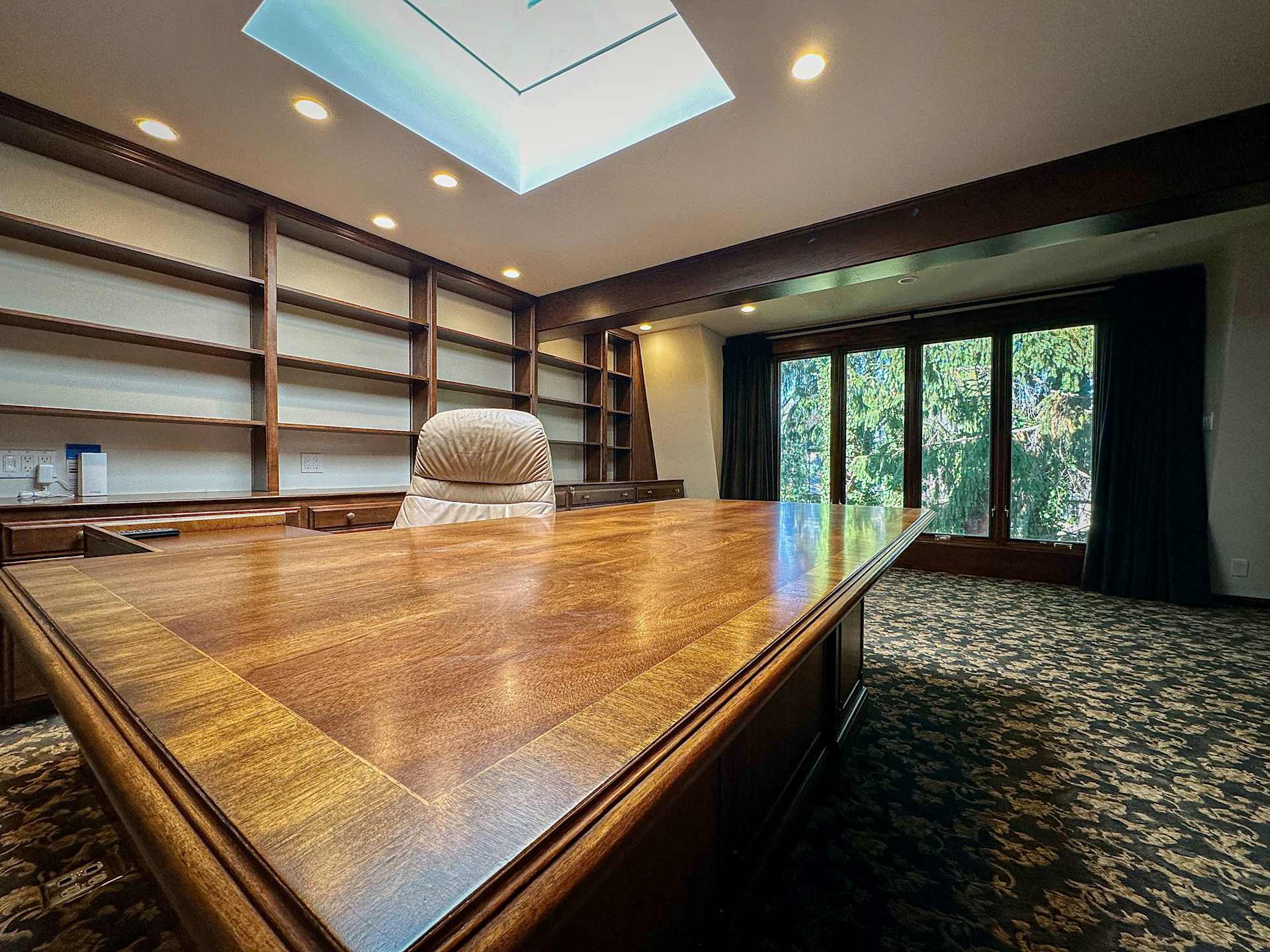 As if that weren't enough, the second story of the primary bedroom, a surprising revelation in itself, houses the main office of the home. Here, one can attend to the day's business amidst the deep natural wood highlighted by skylights, built-in shelves, and picturesque views from the second-story windows. It's a retreat within a retreat, offering a harmonious balance of work and leisure in a space that exemplifies the fusion of classic architecture with modern functionality.