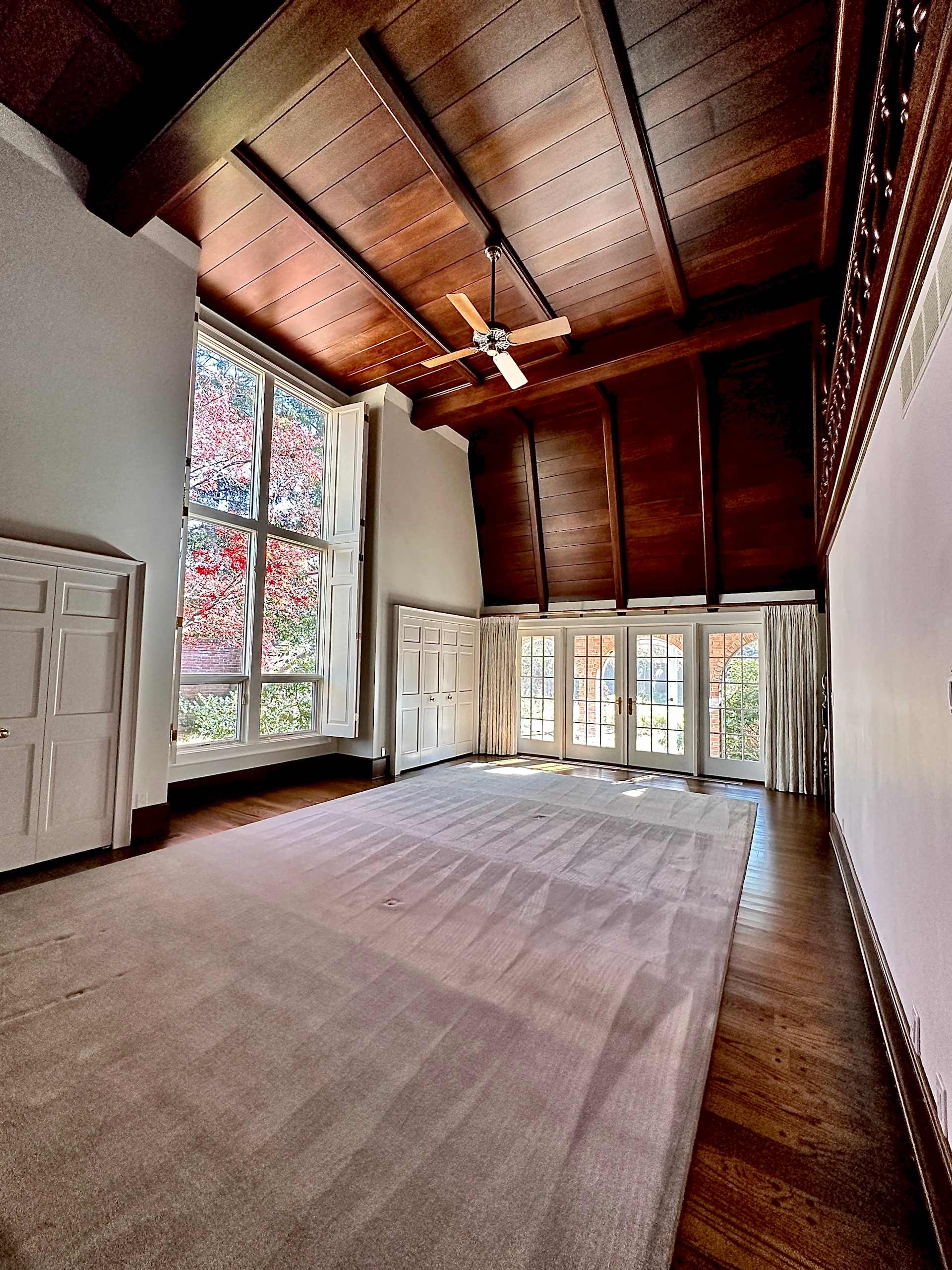 However, the true jewel in the crown of this residence—and arguably the entire estate—is the primary bedroom. The soaring cherry walls and ceiling, reaching nearly 30 feet in height, initially seem imposing. Yet, the dark, rich wood creates an atmosphere of warmth, coziness, and unparalleled comfort. It's a masterful blend of grand scale and intimate retreat, a testament to the thoughtful design of this unique home.