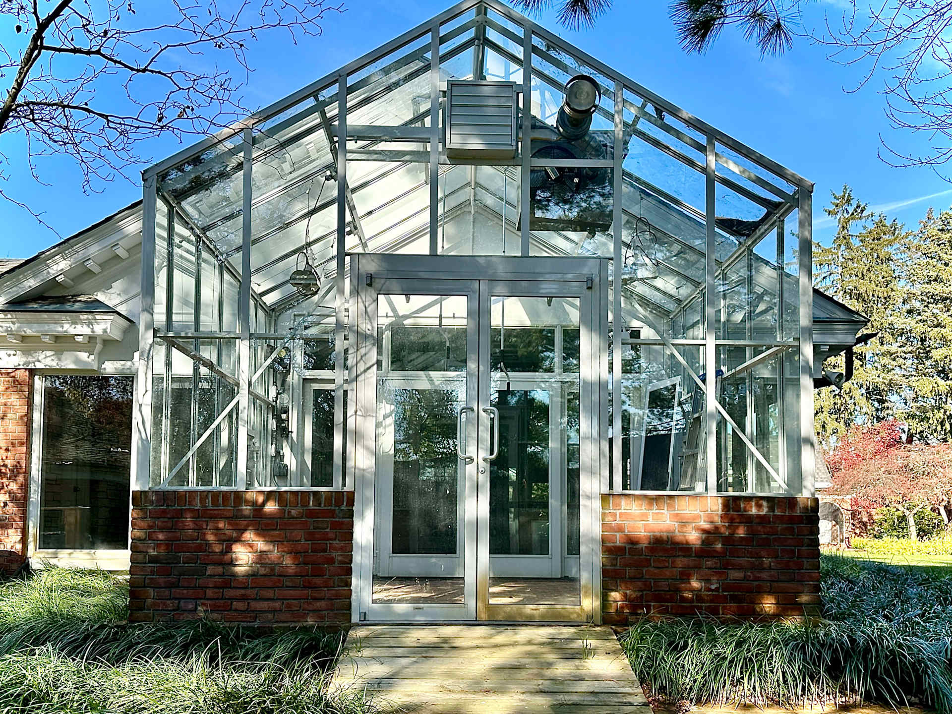 Continuing the exploration beyond the kitchen and service kitchen, one encounters an unexpected gem: the gym. This 785-square-foot space, with vaulted ceilings and mirrored walls, creates a sense of expansiveness that defies the typical expectations of a 1958 ranch. It exudes a feeling of grandeur, providing an ideal setting for fitness and recreation. Adding to the surprises, the home's greenhouse extends gracefully from the west corner of the gymnasium, seamlessly blending the realms of exercise and nature.
